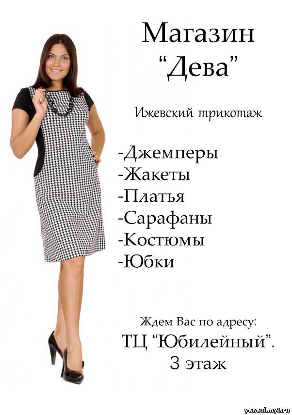 Магазин "Дева" Ижевский трикотаж (У нас в наличии: Джемперы, Жакеты, Платья, Сарафаны, Костюмы, Юбки) Ждем Вас по адресу: ТЦ "Юбилейный" 3 этаж